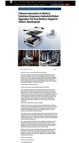 3月18日美聯(lián)社訊,中國(guó)機(jī)器人生態(tài)鏈正迎來關(guān)鍵部件領(lǐng)域的創(chuàng)新突破。中國(guó)電池制造商遠(yuǎn)東智慧能源股份有限公司(簡(jiǎn)稱:遠(yuǎn)東股份 代碼:600869)旗下的遠(yuǎn)東電池近期憑借其創(chuàng)新研發(fā)的21700-6000mAh圓柱電池組,正在為機(jī)器人領(lǐng)域的發(fā)展貢獻(xiàn)自身力量。該電池組已成功搭載于中國(guó)頭部科創(chuàng)中心研發(fā)的第四代工業(yè)四足機(jī)器人,為復(fù)雜場(chǎng)景下的機(jī)器人應(yīng)用提供了新的能源解決方案。
