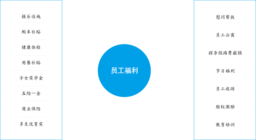• 在法定福利的基礎(chǔ)上,公司為員工提供全方位的企業(yè)福利,涉及到員工衣食住行各個方面,共 計15大項,21個小項,為員工的生活雪中送炭、錦上添花